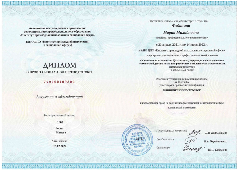 Очень благодарен Марии Михайловне Федяниной за поддержку и искреннее внимание. С ее помощью мне удалось преодолеть серьезные конфликты и преодолеть трудности, которые мешали жить. Мария Михайловна создала атмосферу доверия, где можно было открыться и начать работать над собой. Я чувствовал значительные изменения в своем самочувствии и настроении. Рекомендую этого замечательного специалиста всем, кто нуждается в профессиональной помощи!