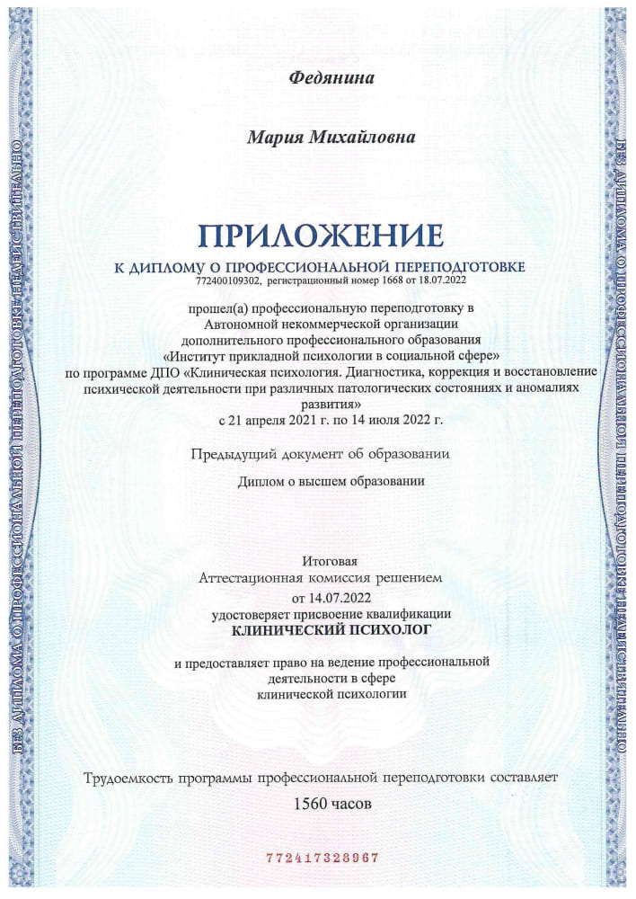 Благодарю Марию Михайловну Федянину за внимание и профессиональный подход. В ходе лечения я рассчитывала на поддержку и понимание. Она помогла мне разобраться в себе и найти правильные решения в сложной ситуации. Каждый сеанс был для меня обязательным шагом на пути к восстановлению. Мария Михайловна — невероятно чуткий и квалифицированный специалист, и я рада, что обратилась именно к ней за помощью.