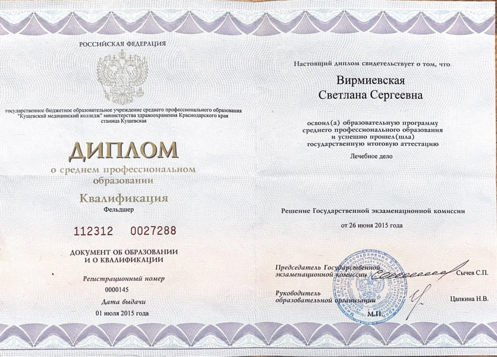 2005 - Кущевский медицинский колледж (лечебное дело).