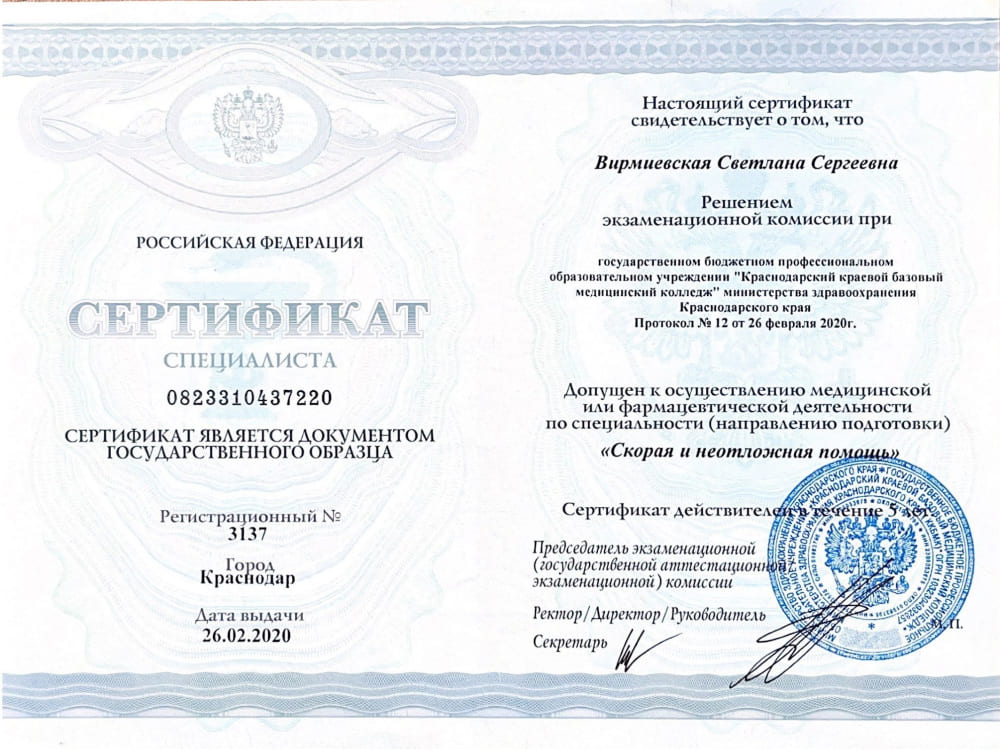 2020 - прошла обучение в Краснодарском краевом базовом медицинском колледже по программе «Скорая медицинская помощь»;