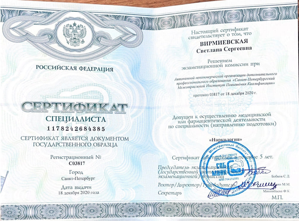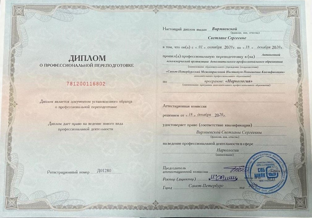 2023 - завершила курс в Санкт-Петербургском межотраслевом институте повышения квалификации по теме «Современные подходы в наркологической помощи».